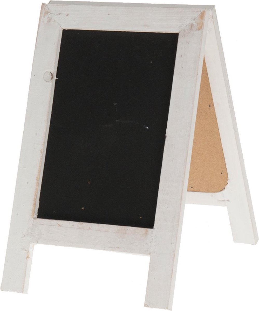 Houten klapbord met aan elke zijde een zwart krijtbord. Leuk voor op tafel met bijvoorbeeld acties of het menu. Afmetingen: 14 x 22,5 cm
