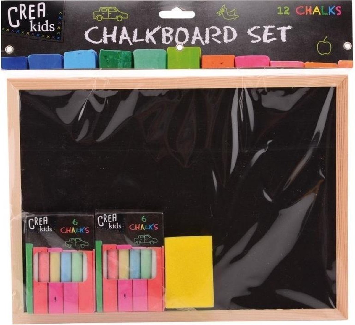 Houten krijtbord/schoolbord 29 cm met 12 gekleurde krijtjes en bordenwisser. Dit krijtbord met houten frame wordt geleverd met 12 gekleurde schoolbordkrijtjes en 1 bordenwisser. Afmeting: ca. 29 x 21 cm. Schoolbordje tekenmateriaal speelgoed voor kinderen.