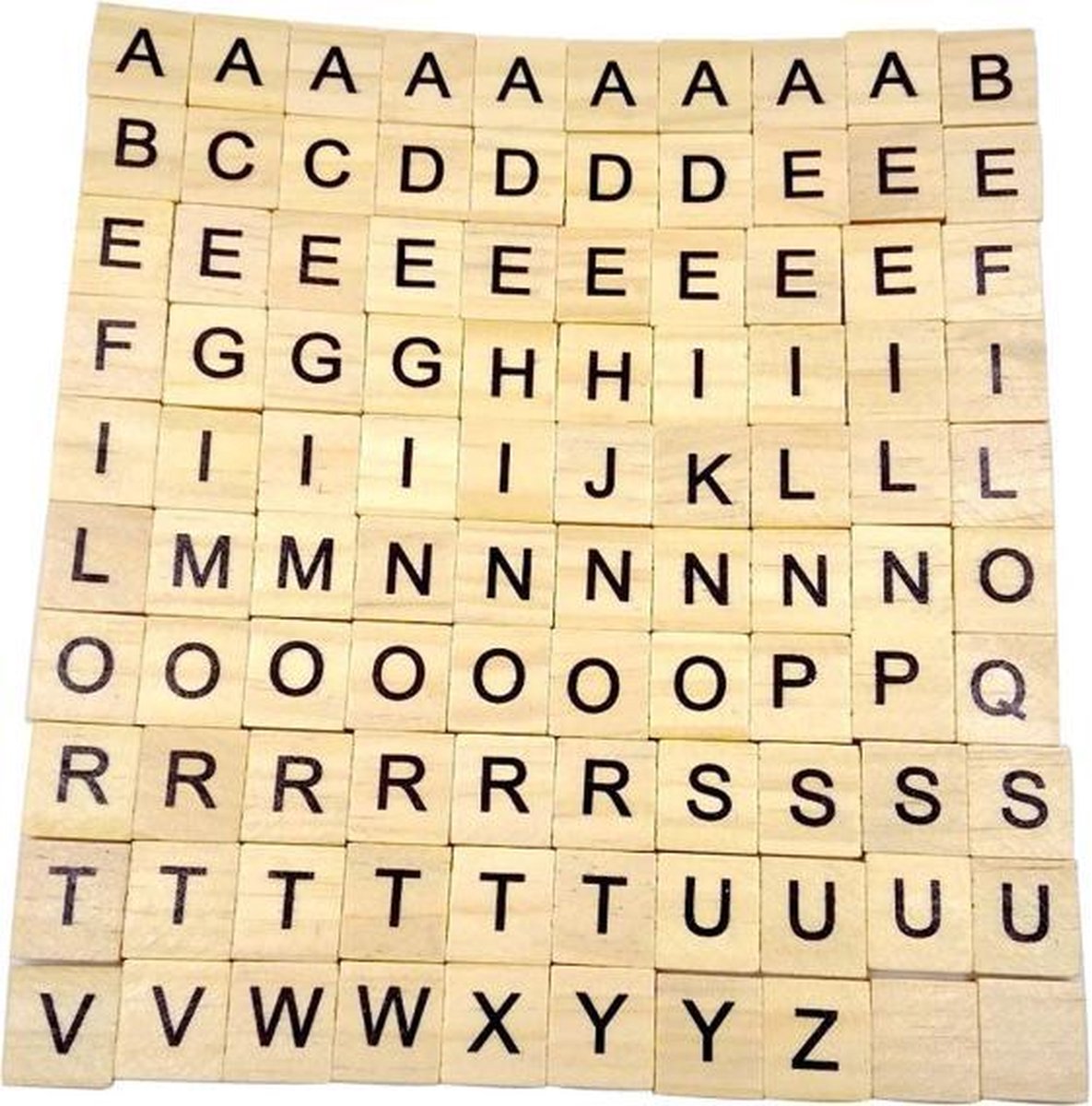 Deze houten letters zijn super leuk om mee te knutselen. Let op! Deze set is niet gelijk aan het scrabble spel. Ze zijn bedoeld voor knutselen. Ze bevatten alleen letters en geen cijfers Set bestaat uit 100 letters en de volgende aantallen per hoofdletter: 1 stuks: K, Q, X, Z 2 stuks: B, C, F, H, M, P, V, W, Y en Blank 3 stuks: G 4 stuks: D, L, S, U 6 stuks: N, R, T 8 stuks: O 9 stuks: A, I 12 stuks: E Materiaal : hout Afmetingen Lengte: 1,8 cm Breedte: 2 cm Dikte: 0,5 cm