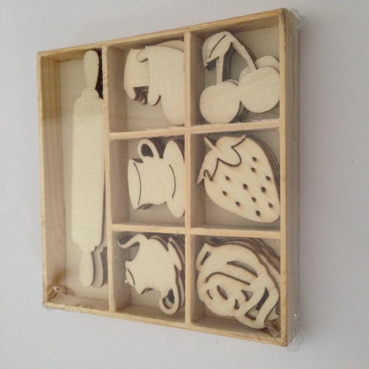 Houten ornamenten doosje Fifties Kitchen 35 pcs - box 10,5 x 10,5 cm. Deze houten ornamenten zijn uitermate geschikt om te verwerken in diverse creaties, te verwerken in een scrapbook en heel leuk op een kadootje!