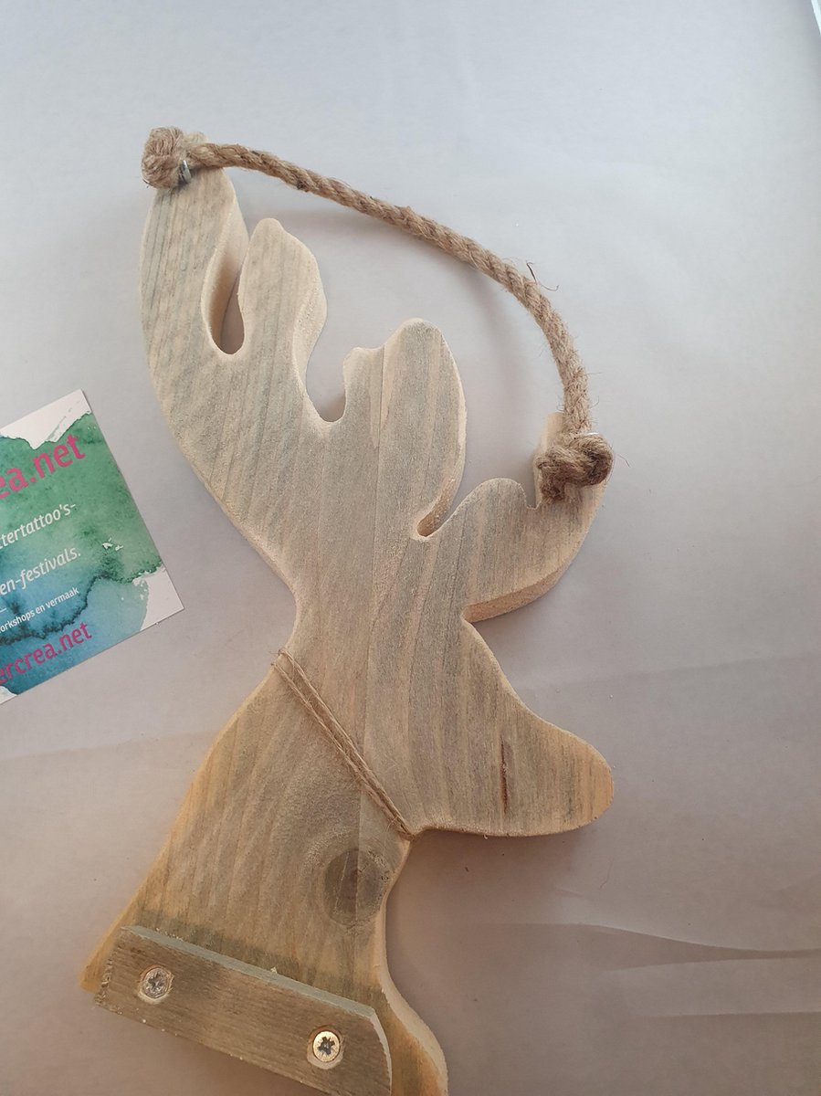 deze onbehandelde houten rendier kunt u versieren of zo ophangen/neerzetten aan de achterzijde zitten de ophang haken en touw al voor bevestigd voor u. leuk om mee te knutselen/versieren of blanco. ook leuk met kerstlampjes