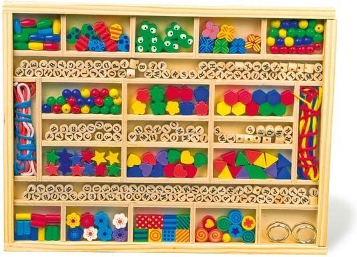 Small foot rijgbox met veel sorteervakken voor het overzichtelijk bewaren van het royale toebehoren. Verbetert de motoriek van de handen. afmetingen: ca. 32 x 2 x 25 cm materiaal: hout