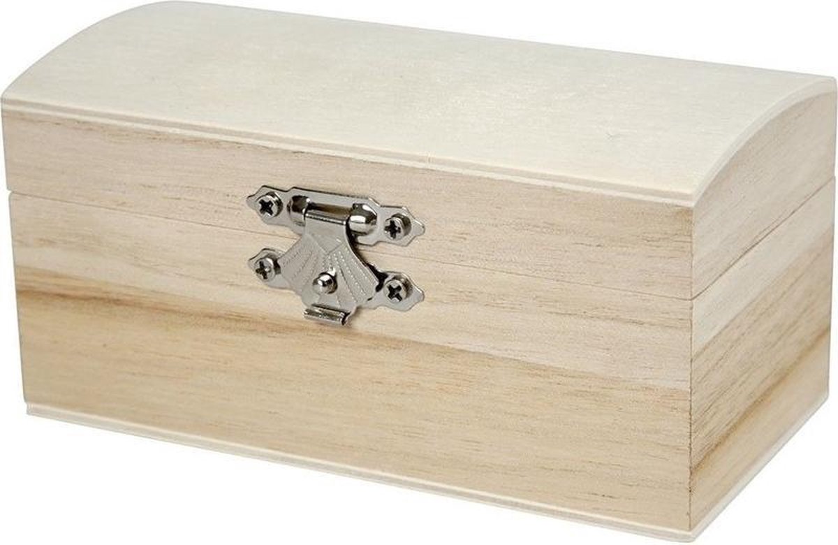 Een blanco houten kistje met ronde deksel en metalen sluiting, om zelf te versieren/schilderen. Het kistje heeft een afmeting van ca. 11,5 x 5,8 x 5,8 cm en een binnenmaat van ca. 10 x 4,3 x 3,6 cm.