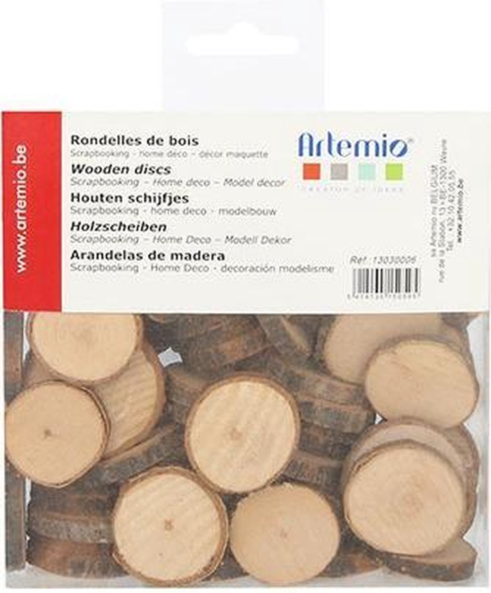 Pakje houten schijfjes. U kunt deze houten schijfjes markeren met een elektrische brandpen of een brandstempel. Elke houten schijfje heeft een ander formaat.