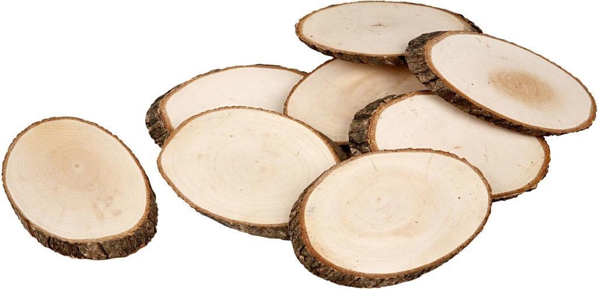 Houten schijven. circa 11x7.5 cm. dikte 8 mm. 12stuks