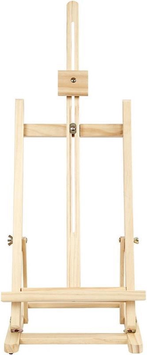 Houten schildersezel 76 cm tafelmodel. Deze grenenhouten, tafelmodel schildersezel heeft een formaat van ca. 76 x 27,5 cm. Geschikt voor (canvas) doeken tot 56 cm in hoogte. Deze tafelezel is inklapbaar en heeft ingeklapt een formaat van ca. 67 x 27,5 x 7 cm. Schilderen op canvasdoeken.