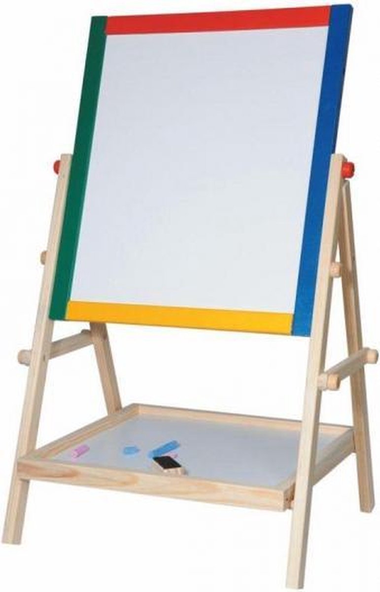 Houten schoolbord staand. Gekleurd houten schoolbord voor kinderen met onderin een plank om bijvoorbeeld de krijtjes en wisser neer te leggen. Het schoolbord wordt geleverd zonder krijt en wisser. Afmeting: 38 x 65,5 cm. Dit betreft een dubbelzijdig bord met een krijtkant en white board kant.