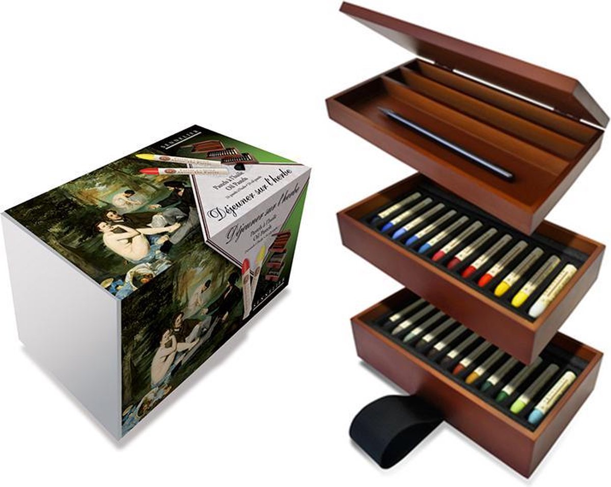 Met deze collectie, gelimiteerde uitgave "Déjeuner sur l'herbe" brengt Sennelier hulde aan één van de grondleggers van het impressionisme, Edouard Manet. Deze sets komen in een prachtige houten versie bestaande uit verschillende plateaus die bijeengehouden worden door een riem om ze gemakkelijk te vervoeren. eens geopend kan de kunstenaar ze op zijn manier sorteren. Deze set bestaat uit 24 oliepastels en 1 grafietpotlood. Sennelier maakt zeer verfijnde oliepastels. Met hun iets langere droogtijd dan gebruikelijk kan je er op een andere manier gebruik van maken in je werkproces.