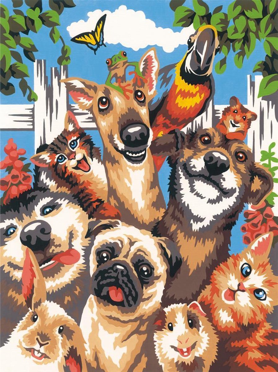 Huisdieren selfie Schilderen op nummer. Je maakt Schilder op nummer schilderij in het formaat . Je ontvangt een los canvas met daarop enkel de lijnen en nummers. Door de genummerde vlakken in te schilderen met de juiste kleuren verf, creëer je je eigen schilderij. Door jou geschilderd met schilder op nummer! Dit schilderij wordt geleverd inclusief: -Canvas met lijnen en nummers -Voldoende potjes en kleuren acrylverf -Penseel. Schilderijen kunnen licht afwijken van de productafbeelding.