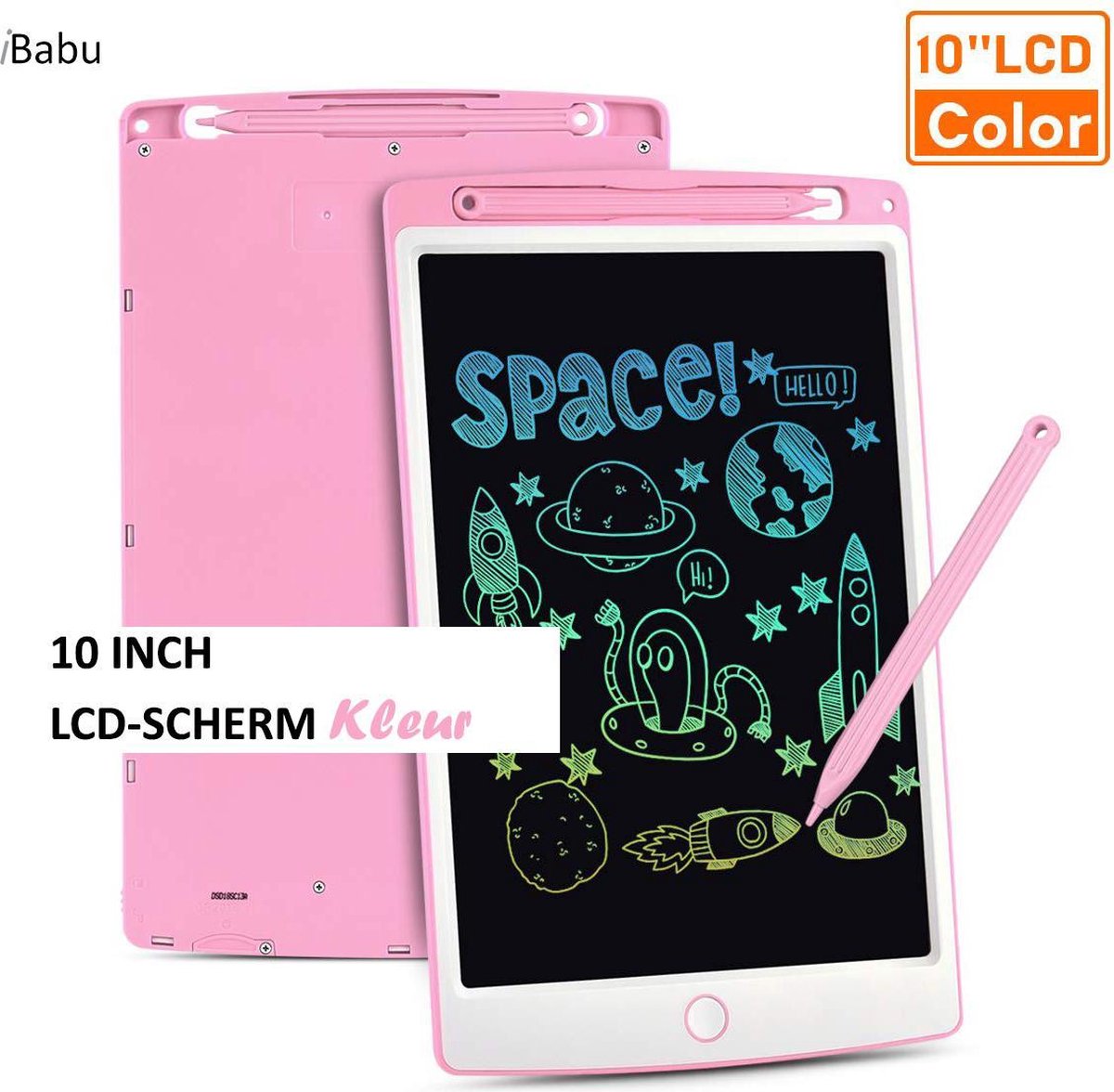 iBabu™ - LCD Tekentablet - Tekenbord voor kinderen | 10 INCH kleurrijke digitale display | Grafische draagbaar tablet met geheugenslot | Leuke en leerzame bezigheid | Roze Leukste cadeau Van de eerste eenvoudige tekeningen tot mooie illustraties, met de iBabu LCD tekenbord kunnen alle kinderen eindeloos tekenen. Dit is het leukste cadeau om weg te geven, omdat kinderen hun creatieve kant kunnen uitleven. A, B, C leren en Tekenen Het is te gek voor woorden, want vanaf nu kunnen ze met pen en tablet alles op hun eigenwijze manier afbeelden. Naast het tekenen is dit een hartstikke leuke middel om kinderen te motiveren voor het oefenen met schrijven en taal. Ze kunnen ook samen woordspelletjes of spelenderwijs de Nederlandse taal leren, dit is toch leuk? Verveling bestaat niet meer. Handige bewaar- en wisknop voor een duurzame karakter Geen probleem, want iBabu LCD tekenbord heeft een handige beschermknop waarmee je je tekening kan bewaren. Met een druk op wisknop begin je weer