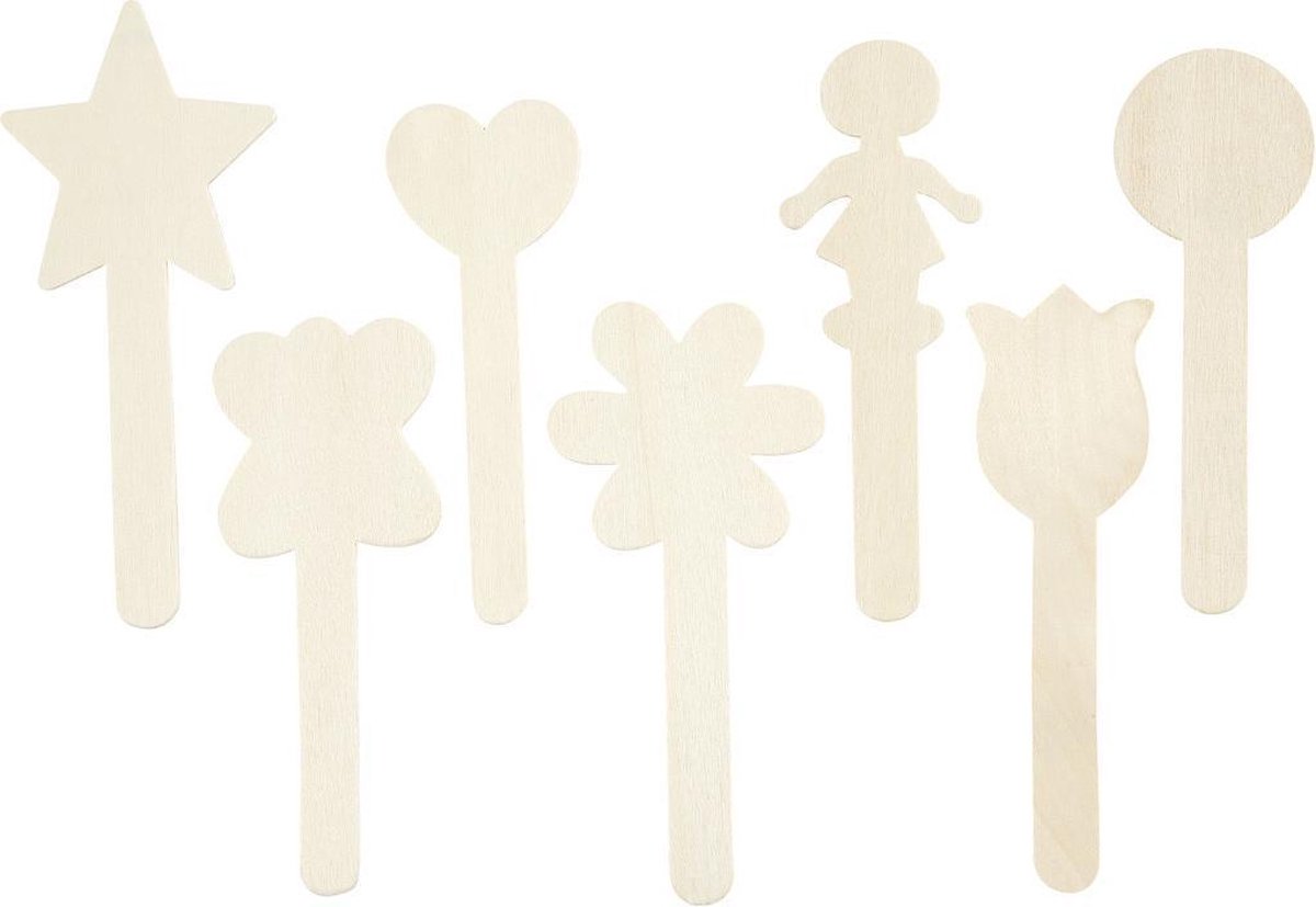 Grappige houten figuren in verschillende ontwerpen.Grappige lolliestokjes met vormen in 7 verschillende designs.