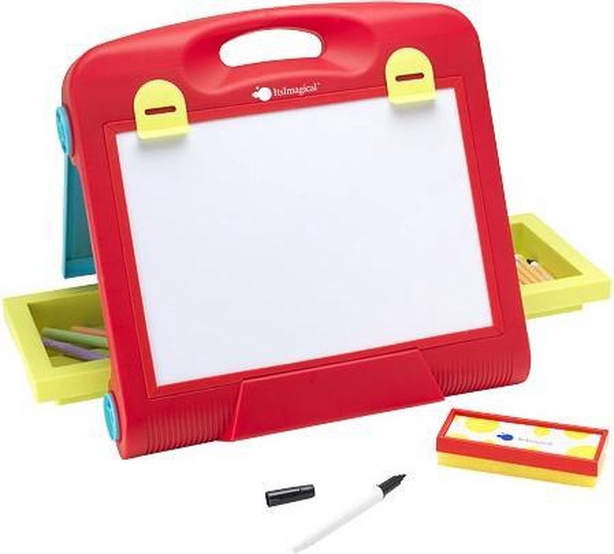 Tweezijdig en draagbaar schrijfbord. Met lessenaarspositie. Inclusief: 12 krijtjes, 24 waskrijtjes, 1 uitwisbare viltstift, 1 wisser en 10 vellen papier. Dit koffertje bevat twee schrijfborden, een bord voor krijt en papier en één wit bord voor uitwisbare viltstift. Het witte bord is magnetisch! Je kunt de opbergladen naar buiten openschuiven. Het papierbord heeft een lade om de penselen en de verf in op te bergen. Gebruik enkel olievrije, uitwisbare viltstiften op waterbasis om op het witte bord te schrijven. Gebruik nooit viltstiften op oliebasis. De verf bevat geen ingrediënten met melkeiwitten. Net als al het speelgoed van Imaginarium wordt deze Area Color Múltiple ook leuk voor je ingepakt!
