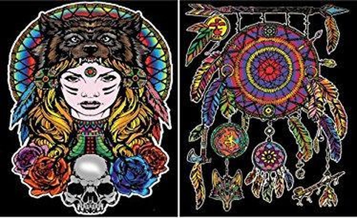 Indiaan met Dromenvanger Colorvelvet map kleurpakket inclusief 12 stiften. Wat is Colorvelvet? Met Colorvelvet maak je de mooiste kunstwerken maar niet zoals de standaard kleurplaten. De tekeningen zijn gemaakt van een speciaal absorberend karton, gedeeltelijk bedekt met een 1mm dikke zwarte laag fluweel waardoor je een duidelijke scheiding krijgt met hetgeen wat je moet inkleuren. Behalve dat dit stuk fluweel ervoor zorgt dat je de witte vlakken makkelijk kunt inkleuren komt het zwarte fluweel naar voren wat een heel chique geheel geeft op je Colorvelvet kleurplaat. Deze tekeningen zijn eenvoudig, dit maakt Colorvelvet leuk en leerzaam waardoor dit ideaal is voor alle leeftijden vanaf 3 jaar en ouder. Met colorvelvet hebben kinderen plezier en leren ze tegelijkertijd, waardoor ze kleurrijke tekeningen maken waarmee ze ook hun slaapkamer kunnen versieren. Maar ook voor volwassenen is Colorvelvet zeer geschikt om lekker creatief bezig te zijn. De tekeningen kan je op allerlei