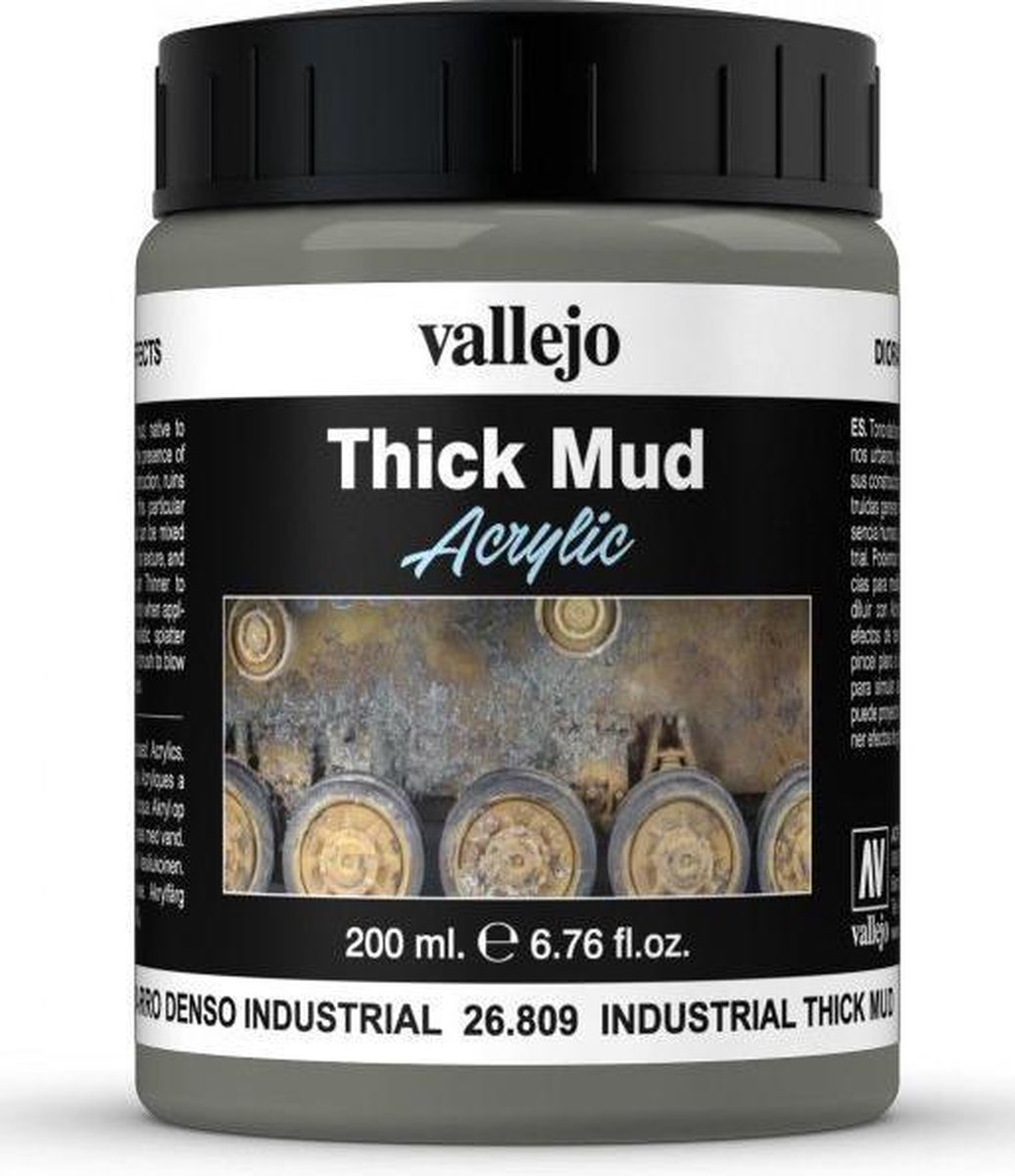 Vallejo Industrial Mud Thick Mud Weathering Effects contains 200ml Industrial Mud Thick Mud. The color of grayish mud, native to urban environment, where the presence of human activity, industrial construction, ruins and decay, have caused this particular shade of sludge. The range consists of 6 products with a heavy and thick consistency and a slightly glossy finish, ideal for reproducing terrain on vignettes or dioramas, as well as for texture on wheels and the lower part of vehicles, the chains of armored cars and accumulations of mud on the tracks. The remains of vegetation included in some of the references provide an especially realistic texture to the final aspect of the model.