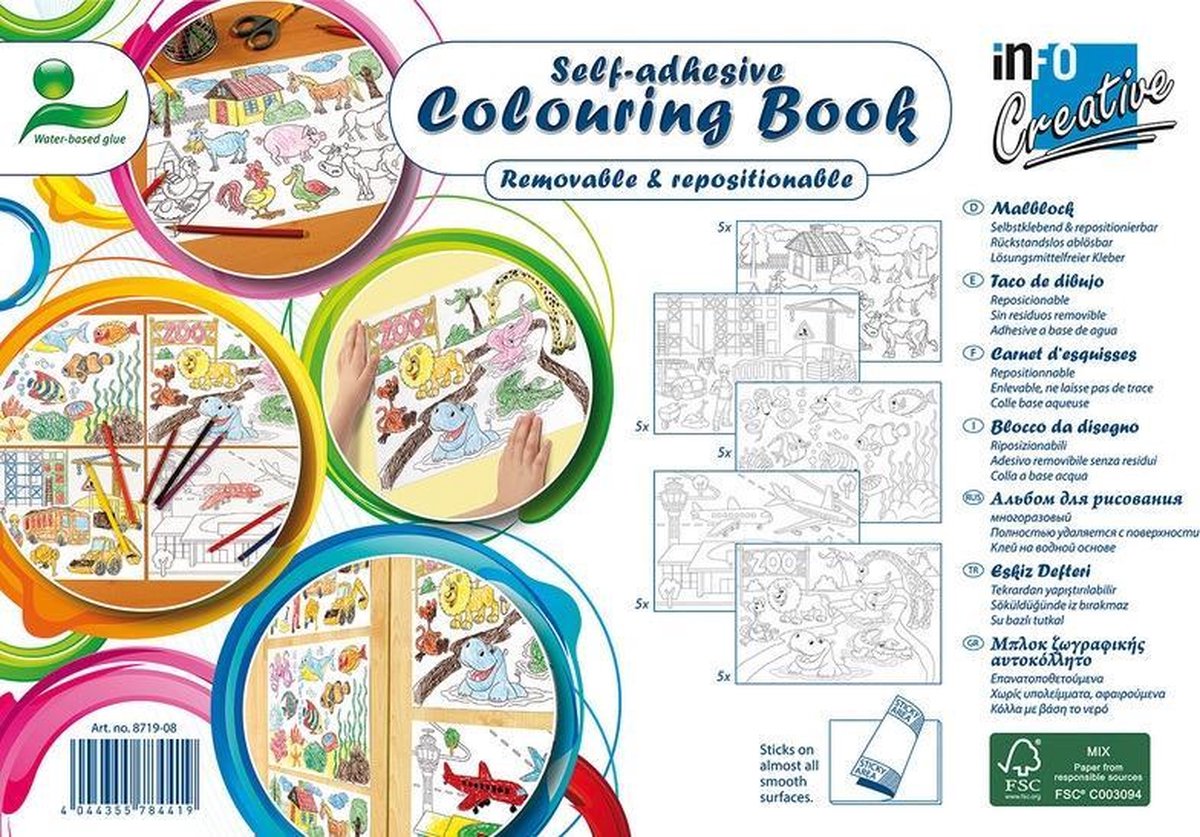 De zelfklevende en verplaatsbare Creative producten zijn het perfecte alternatief voor traditionele kleurboeken. Plak het zelfklevende papier van dit kleurboek op een tafel en wegglijden is onmogelijk. Bevestig deze tekeningen aan de wand en laat er een aantal 'kunstenaars' op los. Dit kleurboek bevat 5 verschillende motieven en van ieder motief 5 kleurplaten.