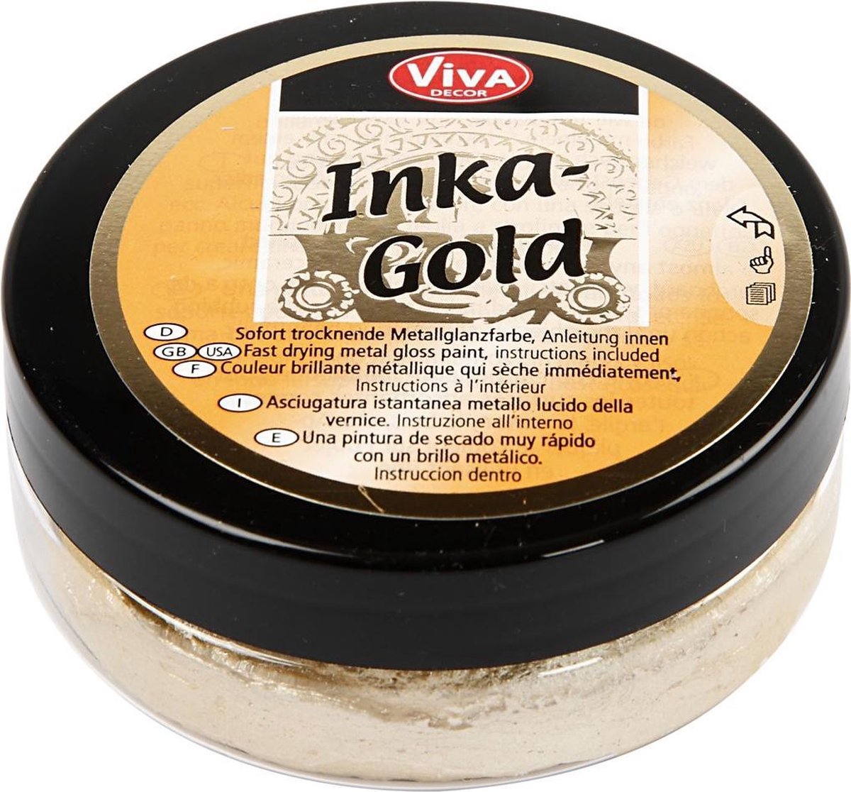 Inka-Gold (50 ml) Crèmige, metalen glanswax. Makkelijk aan te brengen op diverse oppervlakken zoals papier, hout, etc. Door polijsten krijgt de glans nog meer kracht.