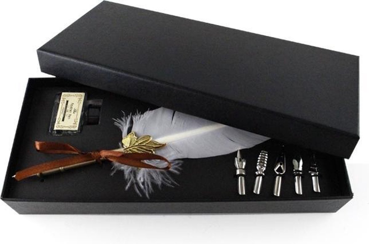 Deze prachtige inktset bevat naast een prachtige verenpen met witte veer, vijf verschillende kroonpennen en een gevulde inktpot. De gehele set wordt geleverd in een prachtige geschenkverpakking! Verenpen met inkt in mooie doos Materiaal: kunststof, fazantenveer Gewicht: +/- 150 gram Minimale bestelhoeveelheid: 1 stuk Artikelnummer: QISW000001
