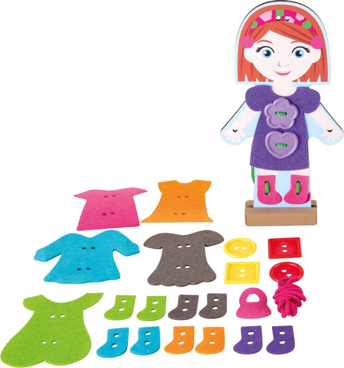 Alle meisjes houden van nieuwe kleren! Met deze creatieve set kan de pop van kleding wisselen wanneer ze maar wil! Verschillende vilten vormen kunnen met draad op de aankleedpop worden geregen. Dit aantrekkelijke figuur kan in een houten standaard worden geplaatst om te bewonderen. Afmeting meisje: ca. 14 x 0,5 x 27 cm Inhoud: 6 jurken, 6 knopen, 6 paar schoenen, 2 veters, 1 handtas, 1 opbergdoos, 1 rijgplank, 1 houten standaard