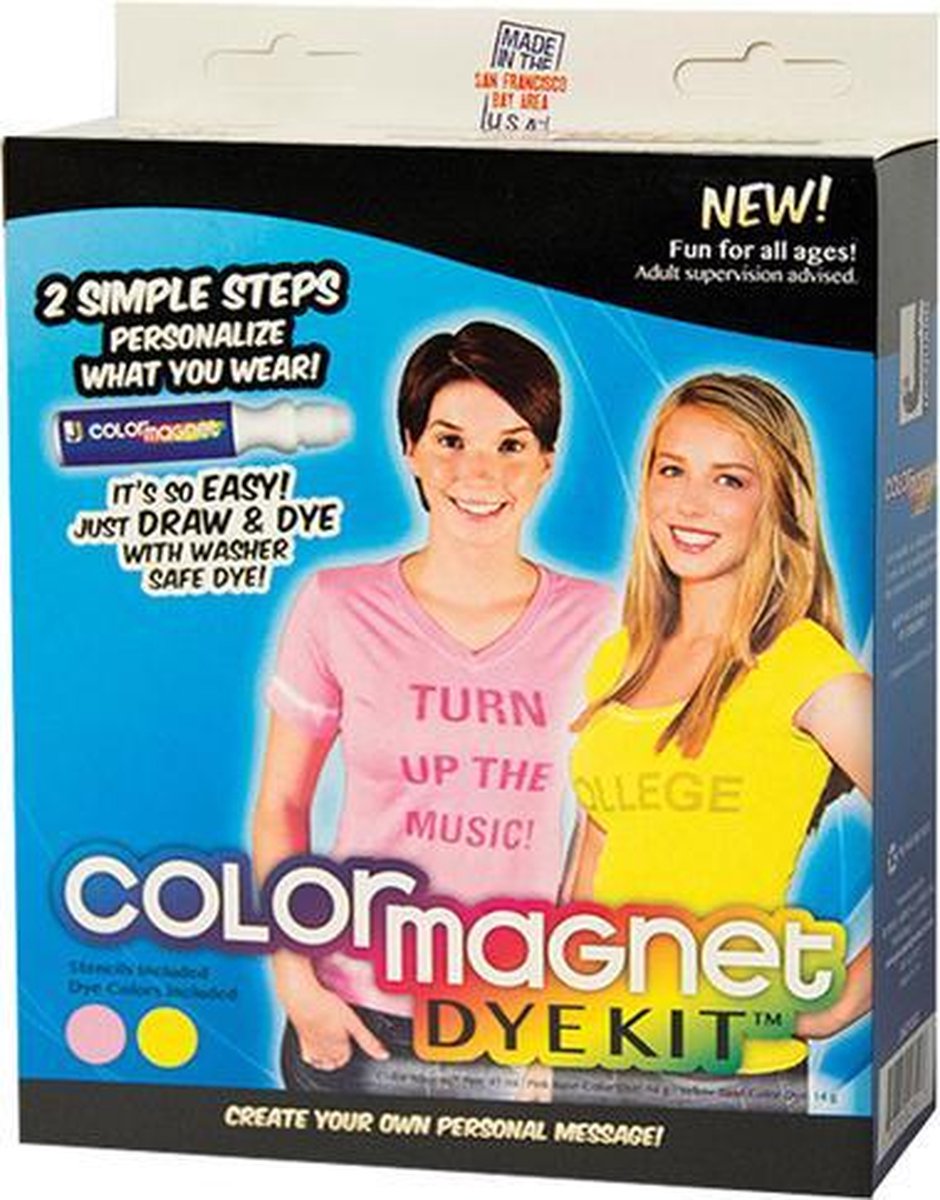 Pas kledingstukken gemakkelijk aan met Color Magnet kleuren set met behulp van de Color Magnet pen en sjablonen (meegeleverd). Nadat Color Magnet is opgedroogd, wast u het kledingstuk samen met het oplosbare, wasmachinebestendige kleurstof in uw wasmachine. Op de plek waar Color Magnet is aangebracht, wordt de kleur van de stof donkerder dan de rest van de stof. Set bevat een Color Magnet pen, 2 kleurstoffen, stencils van leters, cijfers en symbolen, elastiekjes voor eventuele tie-dye effecten en instructies