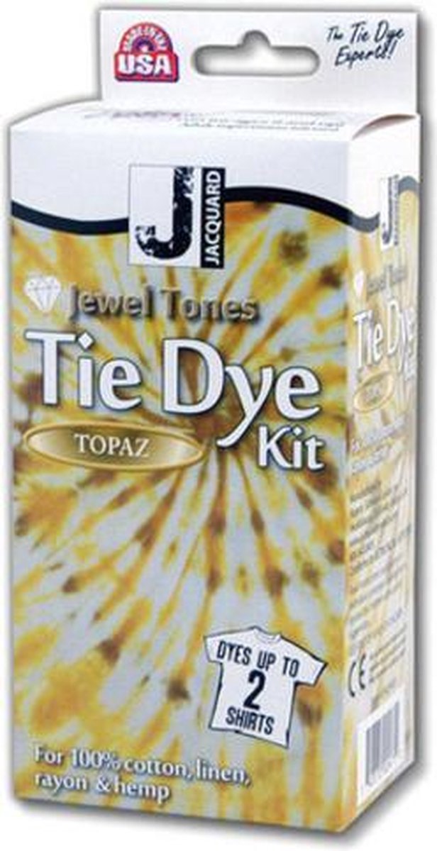 Complete Tie-Dye kit in topaas kleuren. Set bevat de kleurstoffen goud en brons, fixeer medium, handschoenen, elastiekjes, en engelse instructies met knoop technieken voor verschillende patronen, voor 2 projecten