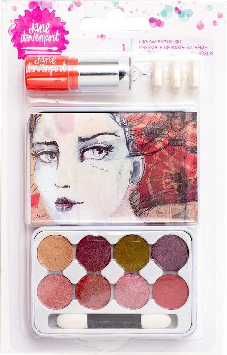 Pastel set van de bekende mixed media artiest Jane Davenport. De set heeft een acht tal kleuren diverse applicatie sticks inclusief reserve applicators, diverse rub-ons en een lippenstif blender.