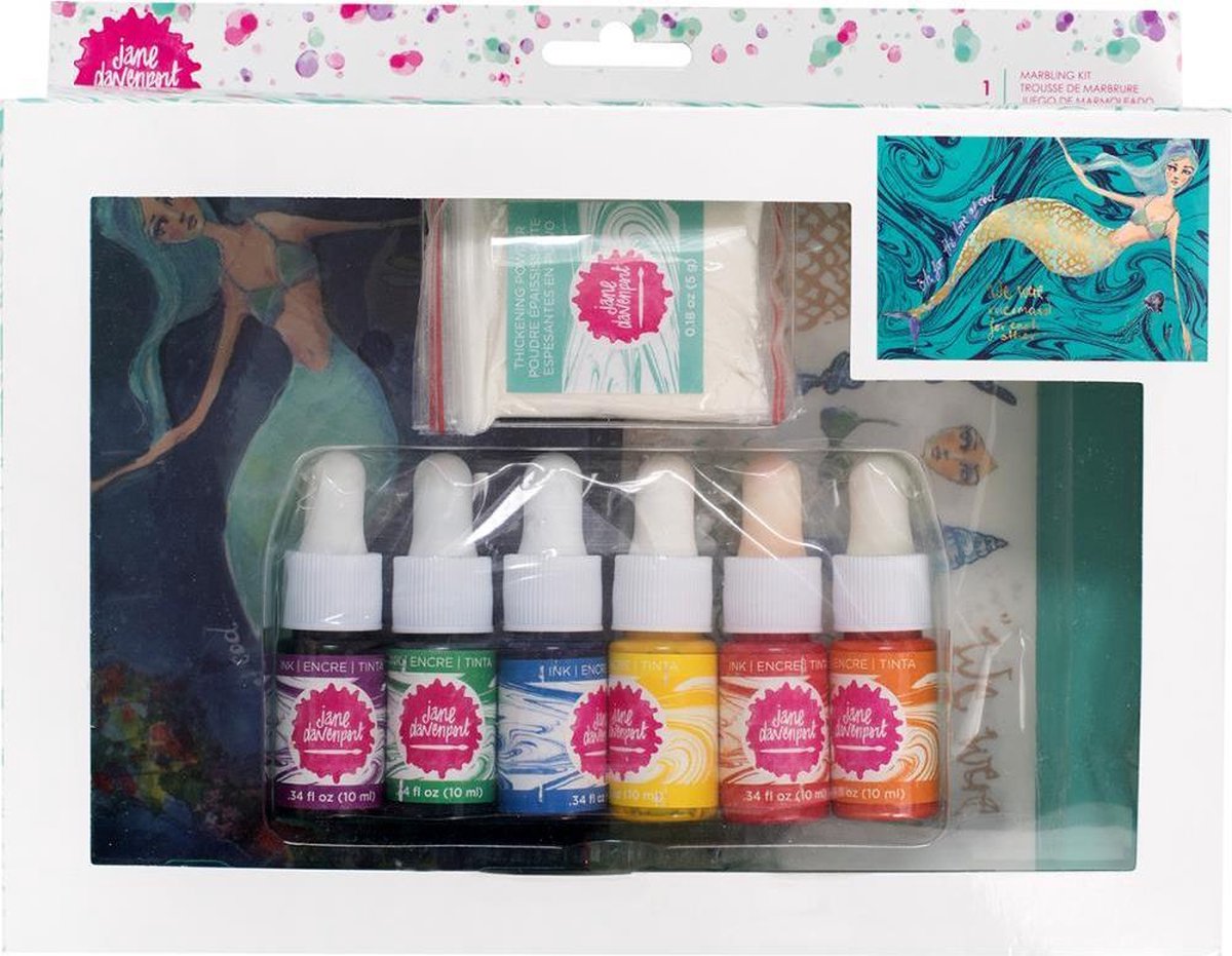 Maak je eigen marble creaties met de marble kit van Jane Davenport. De kit bevat 1 plastic bak, 12 maal 10x15cm velletjes marble papier, 4 maal 10x15 cm washi vellen, 4 maal 10x15 cm vellen zeemeermin rub-ons, 6 flesjes marble inkt en 4 zakjes met verdikkingspoeder.