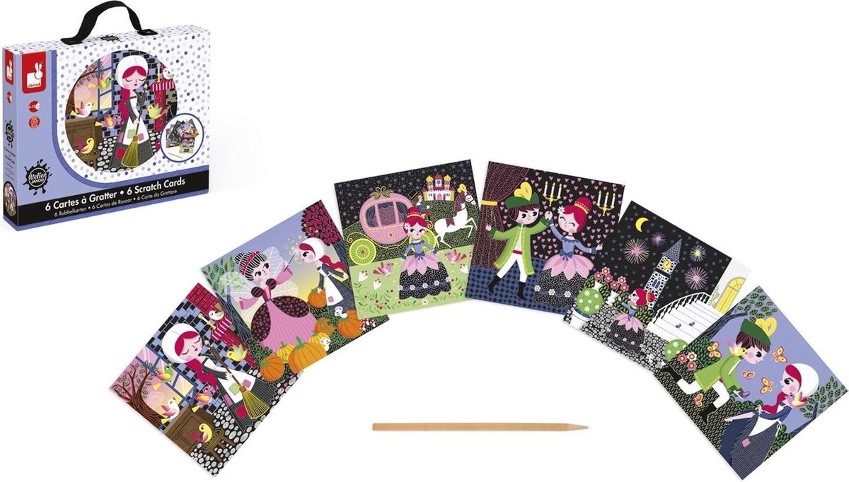 Maak leuke tekeningen met deze kraskaarten!Deze originele set bevat6 kraskaarten over het sprookje Assepoester. Volg het model en kras de zwarte zones weg met een houten pen om verschill-ende taferelen over het leven van de prinses te zien. Komt met een gebruiksaanwijzing (vertaald in het Engels, Duits, Nederlands, Spaans, Italiaans en Russisch). Wordt verkocht in een volledig bedrukte, kartonnen koffer met stoffen handvat. Binnenbekleding van schuimrubber voor een optimale bescherming. 2 duurzame doorzichtige kleefrondjes. Beschermtas voor het transport.
