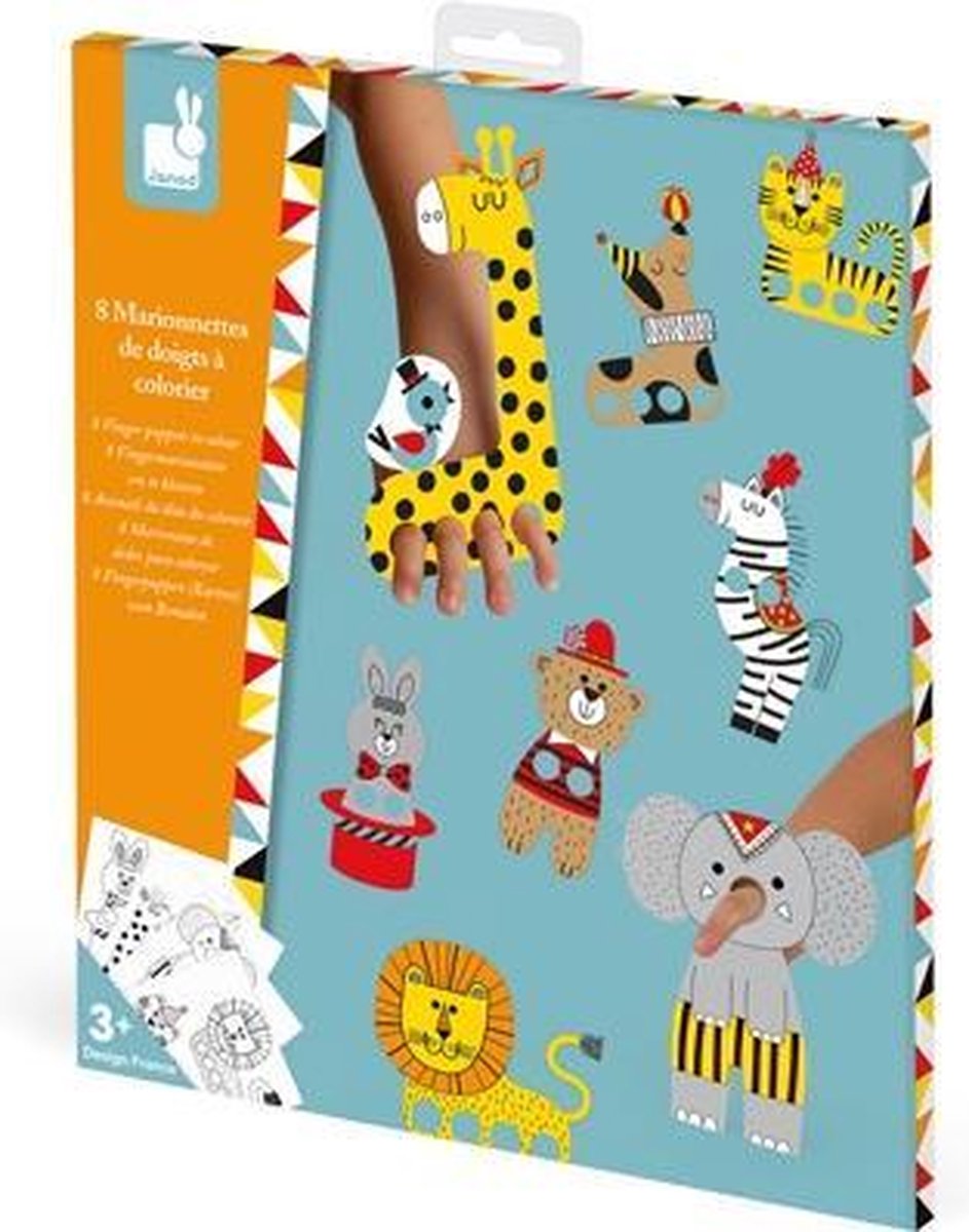 8 vingermarionetten van dik karton om met stiften of verf te kleuren. Handleiding voor de modellen inbegrepen. Creatieve activiteiten die rust en concentratie brengen en tevens geruststellend zijn.