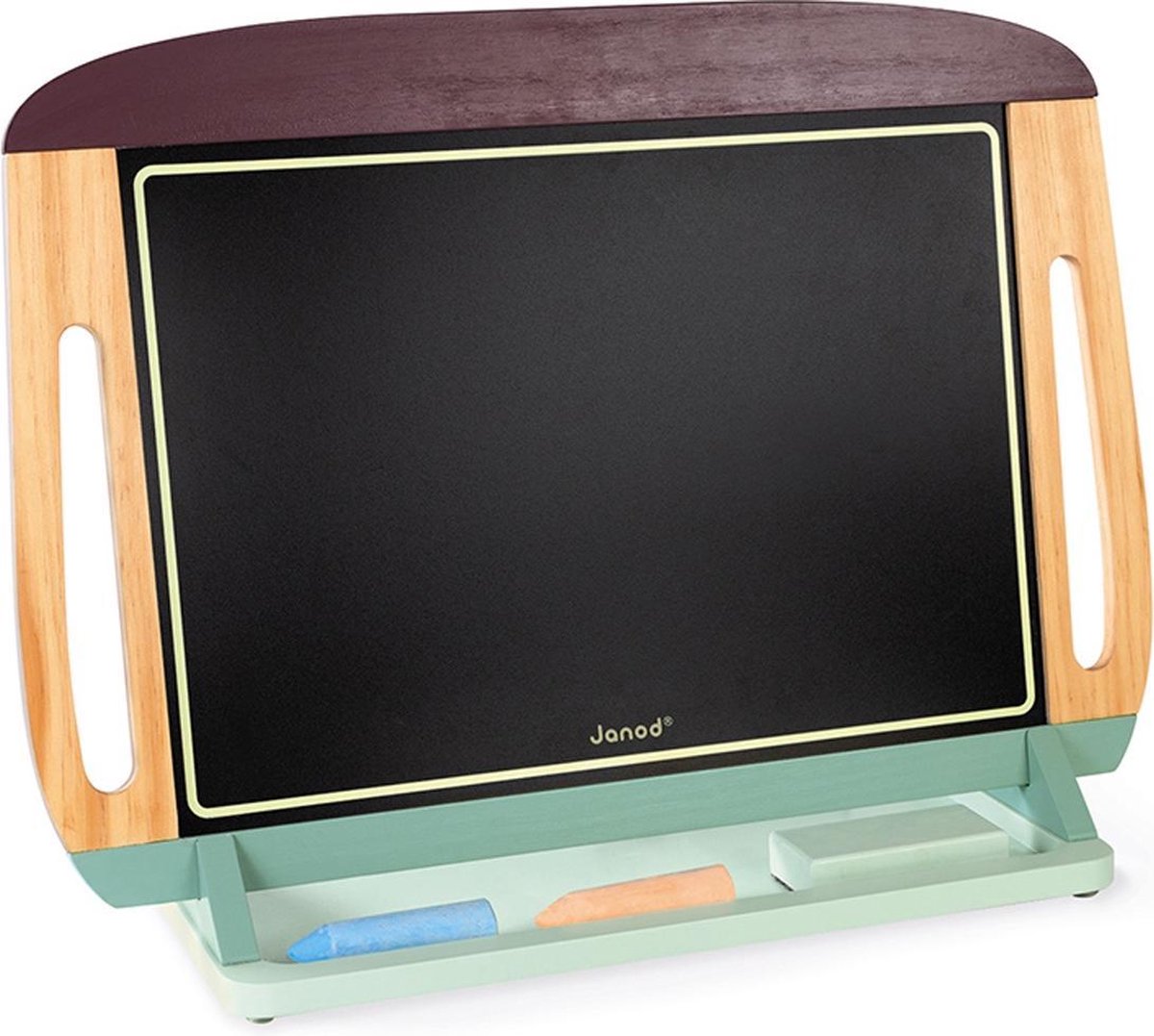 Een grote mobiele leisteen, recto/verso, om te tekenen in de verschillende ruimtes in huis. Ze is gemakkelijk te transporteren en plaatsen op de antisliphouder. Het bord beschikt over een leisteenkant voor krijtjes en over een blanco kant voor uitwisbare stift. Geleverd met 2 grote krijten, 1 uitwisbare stift en een borstel