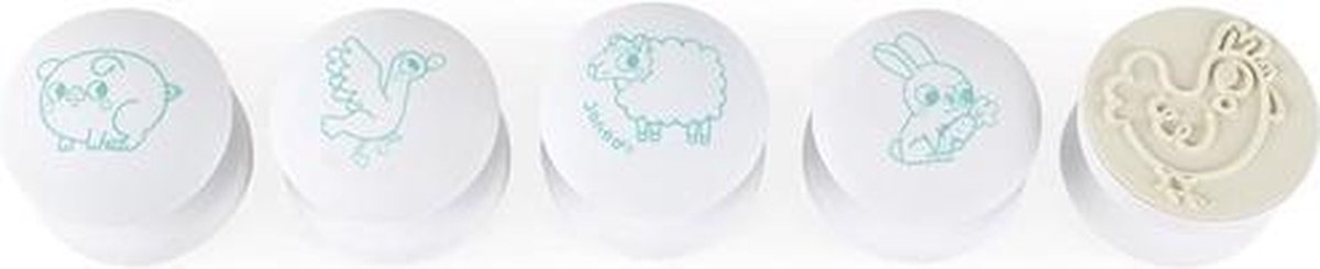 Speelgoed van schuimrubber 5 stempels en 1 stempelkussen De stempels zijn eenvoudig vast te pakken dankzij hun vorm die perfect in de handen van de allerkleinsten past. Ontwikkel de fijne motoriek en de verbeeldingskracht bij uw kind.