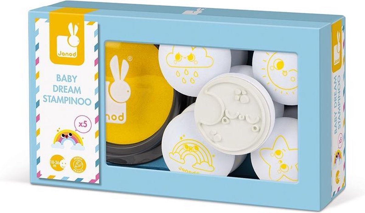 Speelgoed van schuimrubber 5 stempels en 1 stempelkussen De stempels zijn eenvoudig vast te pakken dankzij hun vorm die perfect in de handen van de allerkleinsten past. Ontwikkel de fijne motoriek en de verbeeldingskracht bij uw kind.