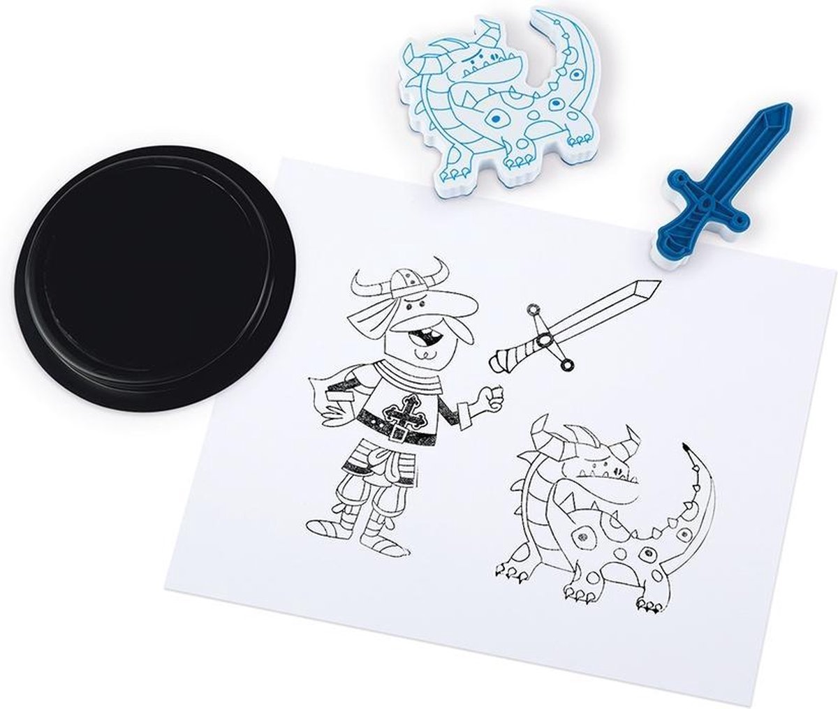 Speelgoed van schuimrubber 30 stempels en 1 stempelkussen. Voor de ridders, de super-soldaten die op zoek zijn naar avontuur en de drakenjagers, 30 stempels om een stoutmoedige wereld te creëren en prachtige verhalen te verzinnen. Ontwikkel de fijne motoriek en de verbeeldingskracht bij uw kind.