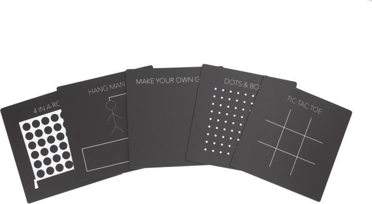 5 krijtborden in reistasje. Bevat volgende spelletjes : galgje 4 op een rij boter kaas en eieren van stip naar stip maak je eigen spel. Op de bordjes kan je spelen met de bijgeleverde butterstix; 4 stofvrije en niet giftige krijtjes. De krijtjes worden bijgeleverd en het krijt is met een natte doek af te nemen. En natuurlijk kan je op de achterkant gewoon tekenen. Leuk voor onderweg, makkelijk mee te nemen uit logeren en fijn met opbergen.