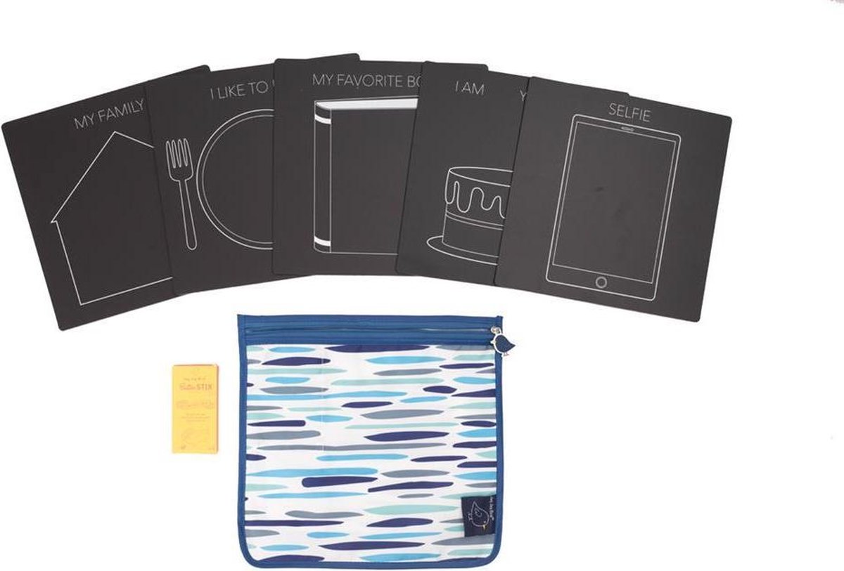 5 Losse krijtborden in een tasje met het thema Selfie: Mijn huis Eten Mijn favoriete boek Verjaardag Selfie Op de bordjes kan je tekenen met de bijgeleverde butterstix; stofvrije en niet giftige krijtjes. Wie woont er in je huis, welk boek lees je het liefst, ik ben al zo oud, dit eet ik het liefst en natuurlijk de echte selfie. De krijtjes worden bijgeleverd en het krijt is met een natte doek af te nemen. En natuurlijk kan je op de achterkant gewoon tekenen. Nadien kan je alle krijtborden weer in de tas opbergen. Leuk voor onderweg, makkelijk mee te nemen uit logeren en fijn met opbergen.