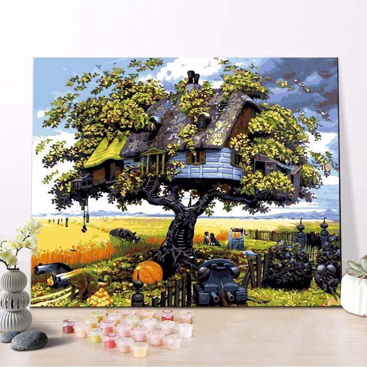 JDBOS ® Schilderen op nummer met frame (hout) – Boomhut tussen de bladeren - Verven volwassenen - 40x50 cm