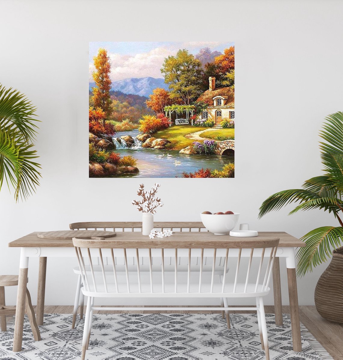 JDBOS ® Schilderen op nummer met frame (hout) - Landschap met huisje beekje en bergen - Verven volwassenen - 40x50 cm