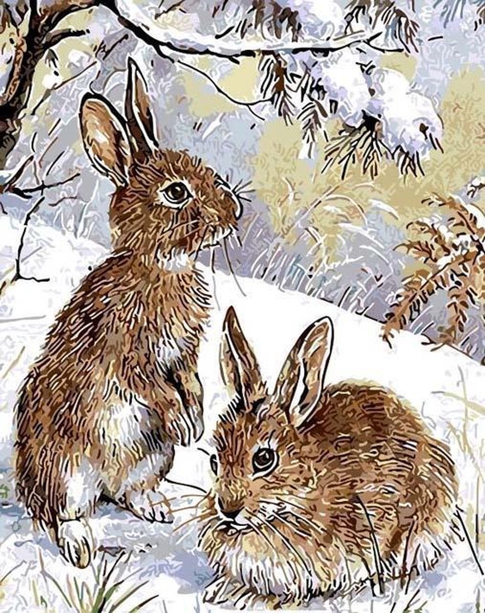 JDBOS ® Schilderen op nummer - Twee konijnen in de sneeuw - Paint by numbers - Verven volwassenen - 40x50 cm
