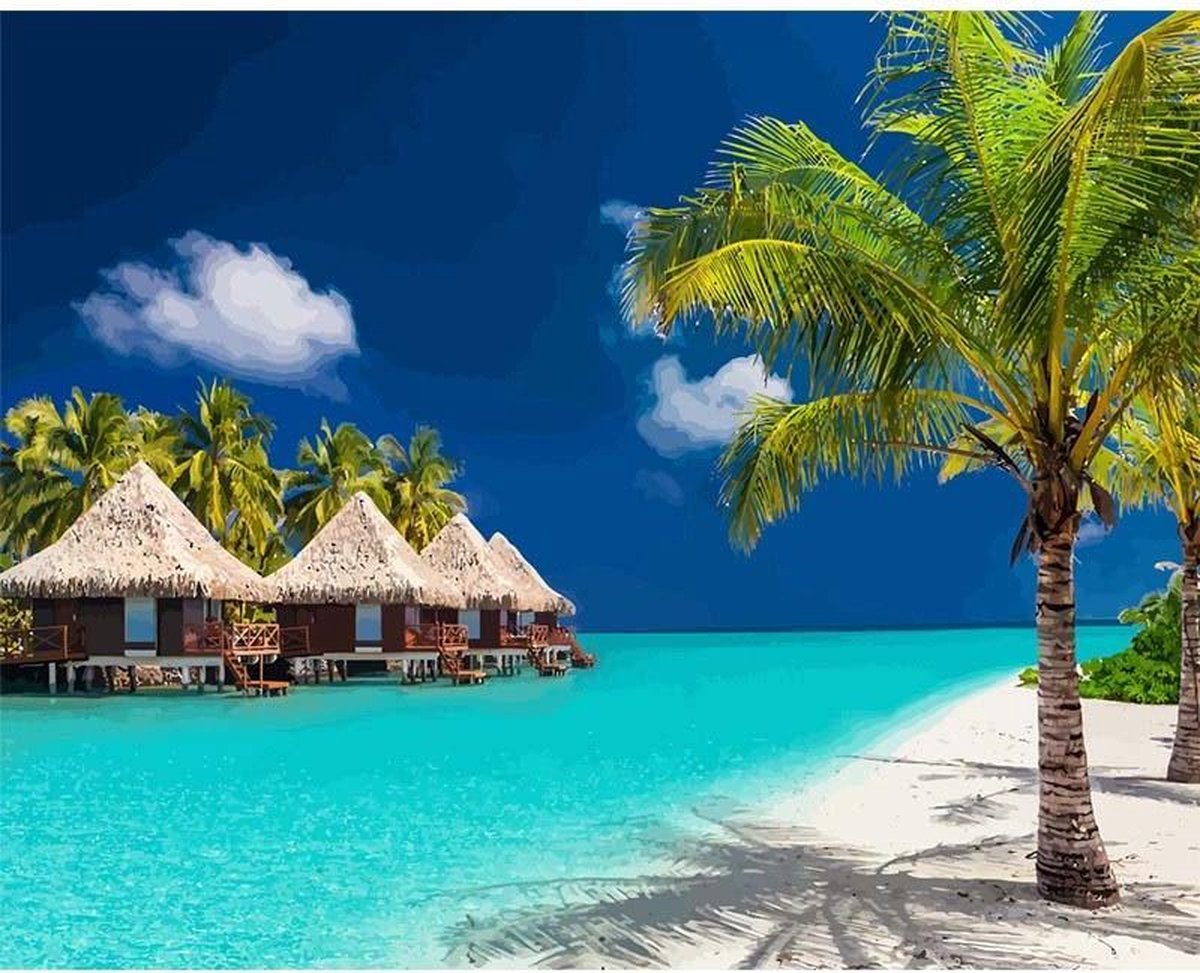 JDBOS ® Schilderen op nummer - Zeezicht met palmbomen en huisjes - Verven volwassenen - 40x50 cm