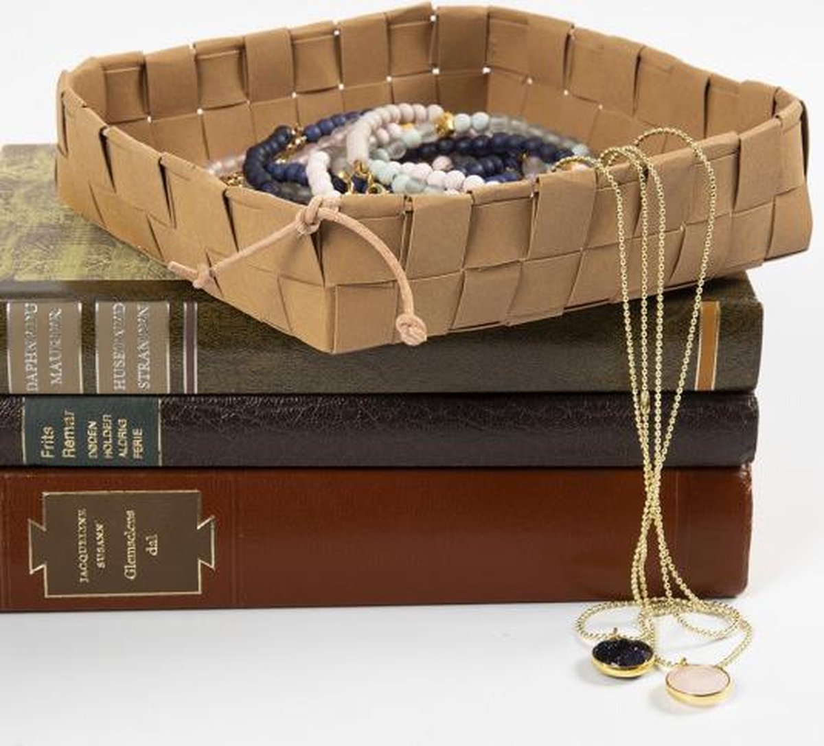 Maak een hele mooie gevlochten mand van leather papier. Het leerpapier is zeer populair in de woonassesoires. De mand is erg leuk om zelf te maken en wordt ongeveer 15x15 cm. Een leuke mand om assesoiris in te houden. Je kunt deze mand voor heel veel dingen gebruiken. Door de duidelijke instructies kan iedereen deze mand maken. Het pakket is met zorg samengesteld en bevat alles dat je nodig hebt om deze mand te maken. Het pakket zit in een leuke geschenktas.