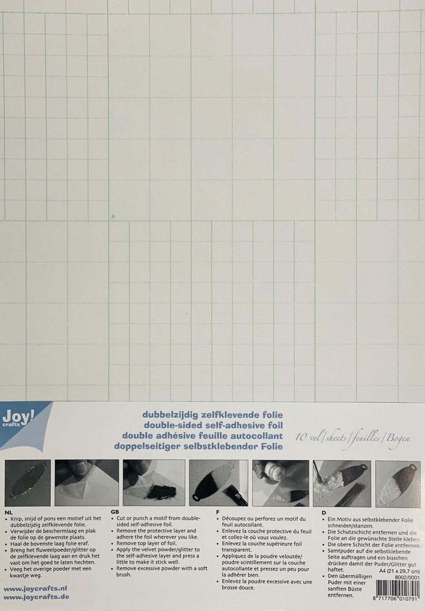 Knip of snijd een motief uit de dubbelzijdig zelfklevende folie. Verwijder de beschermlaag en plak de folie op de gewenste plaats. Haal dan de bovenste laag folie eraf. Breng fluweelpoeder, glitter, papier, karton en andere hobby materialen op de zelfklevende laag aan en druk het vast om het goed te laten hechten. Deze vellen zijn functioneel voor thuis op school en op kantoor.
