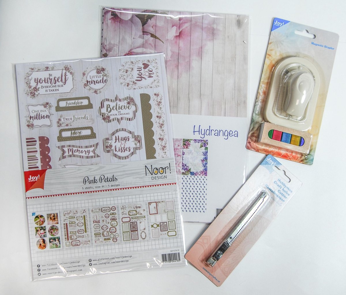Mooie set bestaande uit de 6011/0619 Hydrangea Design Papierset, de 6011/0412 Pink Petals labelvellen, de 6200/0028 Hobbymes en de 6200/0039 Magnetische nietmachine.Deze nietmachine kan u op elke willekeurige plaats neerzetten op het papier/karton om te nieten. Onbeperkt bereik. Het frame is magnetisch, waardoor de nietmachine automatisch wordt uitgelijnd.