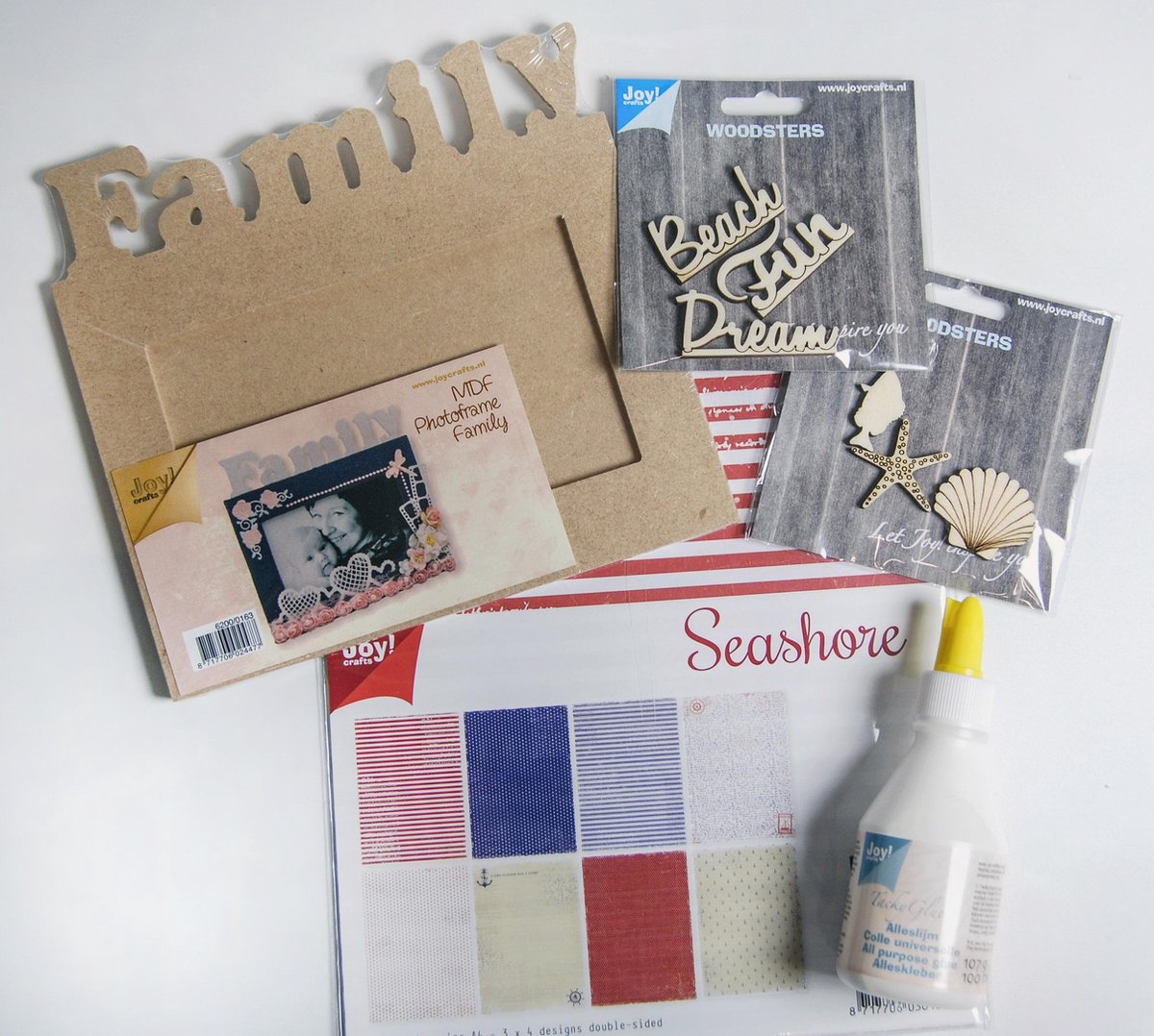 Mooie set bestaande uit de Papierset Seashore, de Woodsters - Houten figuren - Zeester, schelp, vis, de Woodsters - Woorden hout - Dream, Beach, Fun, de Joy! Tacky lijm en het MDF fotoframe Family.