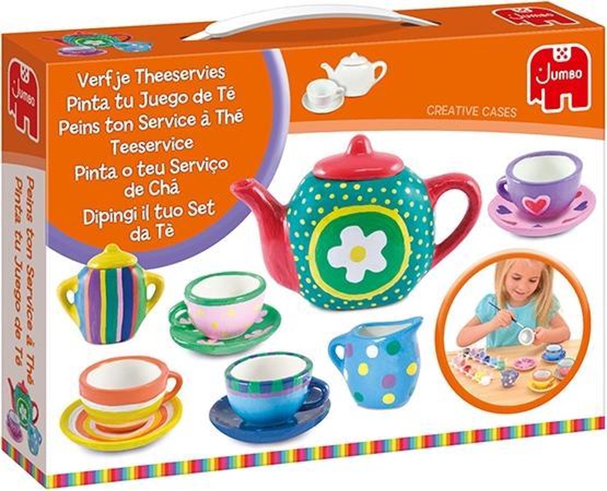 Jumbo verf je theeservies Verf je eigen theeservies in de kleuren die je maar wilt. In de set zitten meerdere kopjes en schotels, zodat je ook voor je familie of vrienden de mooiste creaties kan maken. Specificaties: Kleur: multicolor Geslacht: junior Materiaal: kunststof Leeftijd: vanaf 4 jaar Inhoud: 4 Kopjes 4 Schotels 3 Theepotten 2 Deksels 1 Penseel 1 Verfset (12 kleuren)