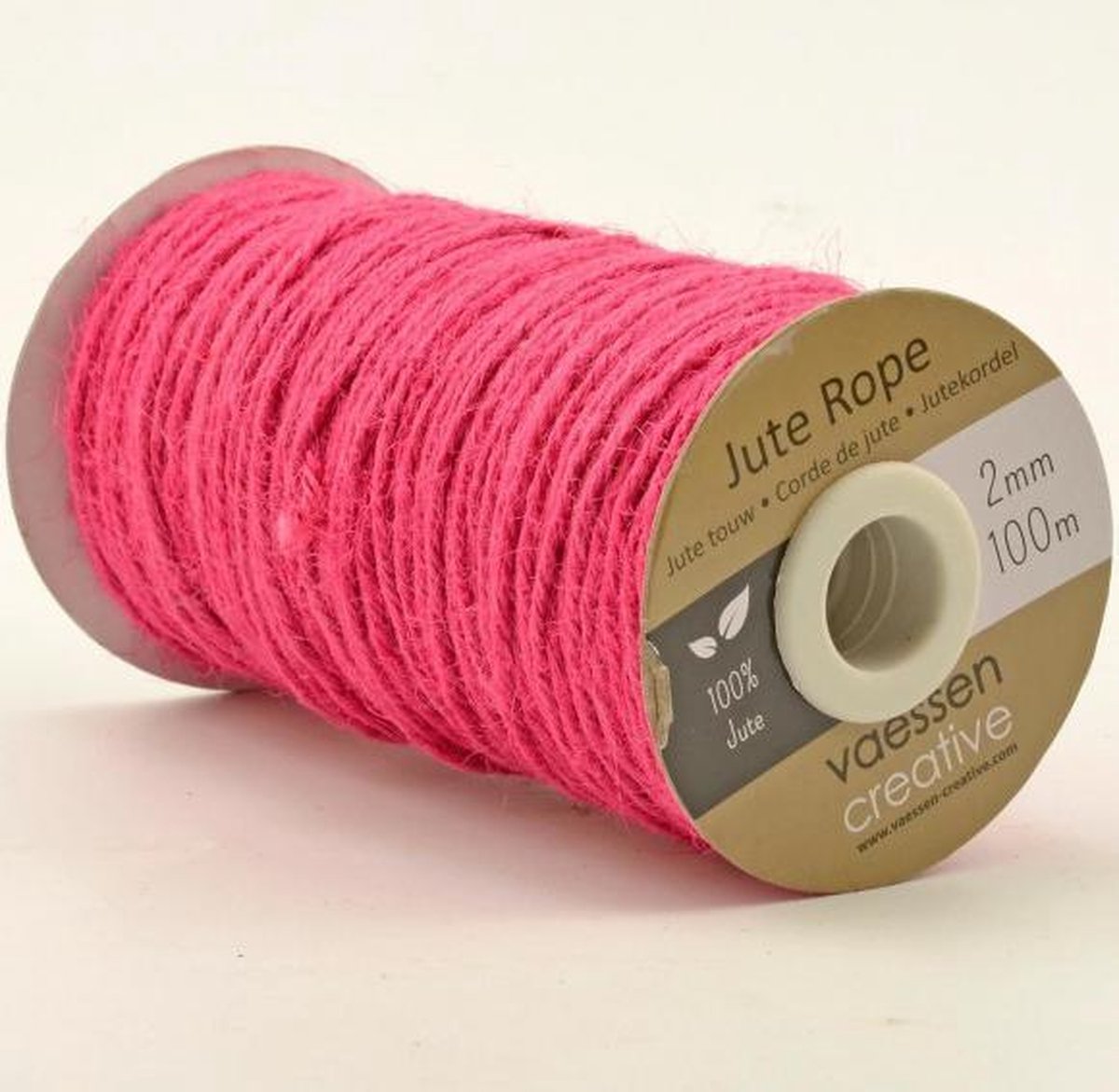 Versier je geboortekaartjes, trouwkaarten of save the dates met dit mooie natuurlijke jute touw. Te gebruiken voor allerlei creatieve projecten! Jute touw op rol 100 meter Kleur: roze / cyclaam Breedte: 2 mm