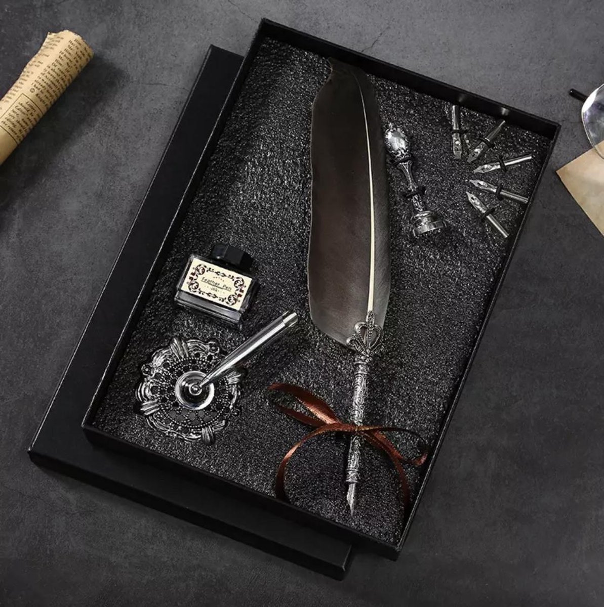 Prachtig kalligrafeerset cadeaubox, echt een super cadeau! Prachtige cadeaubox met alles er op en er aan - zelfs een inktflesje met vijf verschillende diktes penpunten. Prachtige gift box: veer pen + inkt flesje + vijf penpunten Kenmerken: De veren zijn zacht en gemakkelijk te splitsen, en kan worden hersteld door zachtjes met uw vingers in model te vegen. Specificaties: Product size: pen lengte 31-32cm/12.20-12.59 ", geschenkdoos 32*24cm/12.59*9.44" Product gewicht: de hele set van 675g Product materiaal: ganzenveren + alloy pen hengel + rvs nib Writing Girl is de leukste webshop met de fijne schrijfaccessoires en handige kantoorartikelen waar je blij van wordt. Writing Girl krijgt de leukste nieuwe items binnen en geweldig nieuwe merken uit Italië, Zweden, Noorwegen en Duitsland. Check onze website iedere week voor nieuwe artikelen die te gek en handig zijn voor je werk en je inspiratie geven! Wij maken van iedere verpakking een feestje: we pakken je bestelling mooi in een