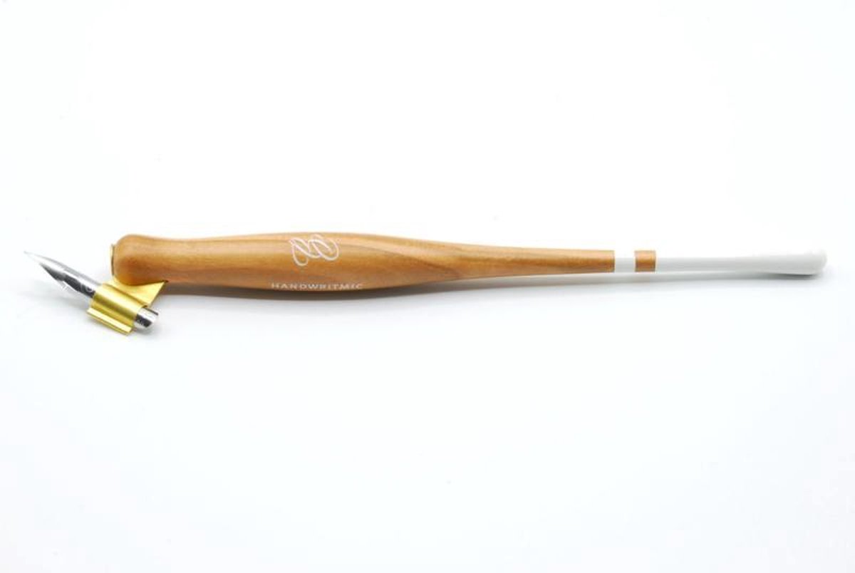 Oblique (schuin) penhouder met een Flange van koper voor Nikko G ( meegeleverd 2 stuks Nikko G Nibs) Speciaal gemaakt voor de studenten van Barbara Calzolari. De houder is gemaakt van kersenhout en is verfraaid met witte glanzende strepen met Barbara's logo. Het formaat en de kopere flange zijn bestudeerd met Barbara Calzolari om een perfecte en bruikbare penhouder te maken voor degenen die het Spencerian schrift willen beheersen. De Nikko G Nib past perfect in de kopere flange, voor Copperplate adviseert Barbara ze om een Hunt 101 te gebruiken die ook past, evenals de Hunt 22, de Principal en de Gillott 303. Nib Houder Handgemaakt in Italië Nikko G Nib Handgemaakt in Japan