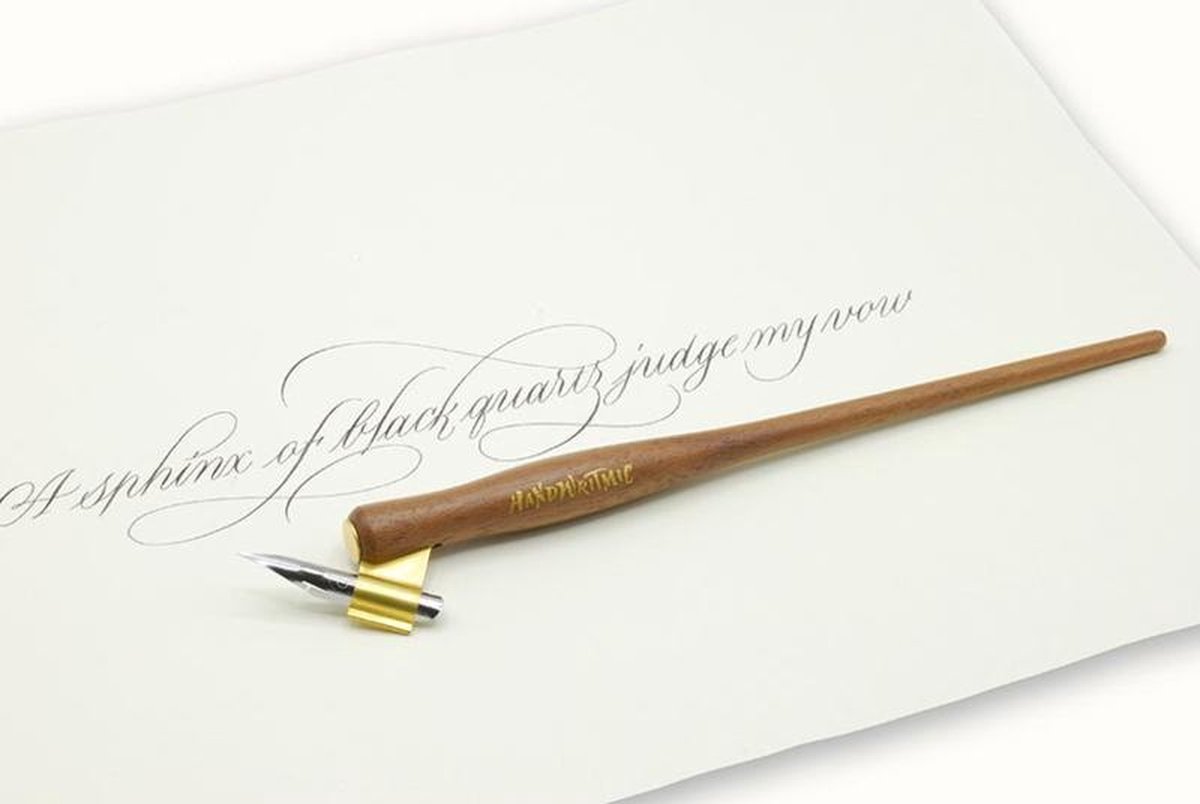 Handwritmic oblique (schuin) penhouder voor de Nikko G Nib Met dezelfde mooie en comfortabele vorm als de elegante penhouders gemaakt met duurzaam hard hout, de koperen flange is perfect afgewerkt en special aangepast voor de Nikko G Nib Walnut Het kernhout is geelbruin, olijfbruin of chocoladebruin, maar het komt vaak voor dat deze licht geelbruin is met donkere aderen en vlammen. Handwritmic oblique penhouder voor de Nikko G Nib. Met dezelfde mooie en comfortabele vorm als de Elegante penhouders gemaakt met duurzaam hard hout, de koperen flange is perfect afgewerkt en aangepast voor de Nikko G Nib Hard hout uit FSC bossen. De penhouders zijn handgemaakt in Italië Een oblique penhouder + 1 Nikko G Nib Een oblique penhouder wordt vaak gebruikt voor Copperplate handschriften, de klassieke manier van kalligrafie. Met de Oblique houder ga je automatisch in de goede hoek(cursief) schrijven. Het blijft je persoonlijke voorkeur wat je het fijnste vindt bij het kalligraferen. Nikko G Nib