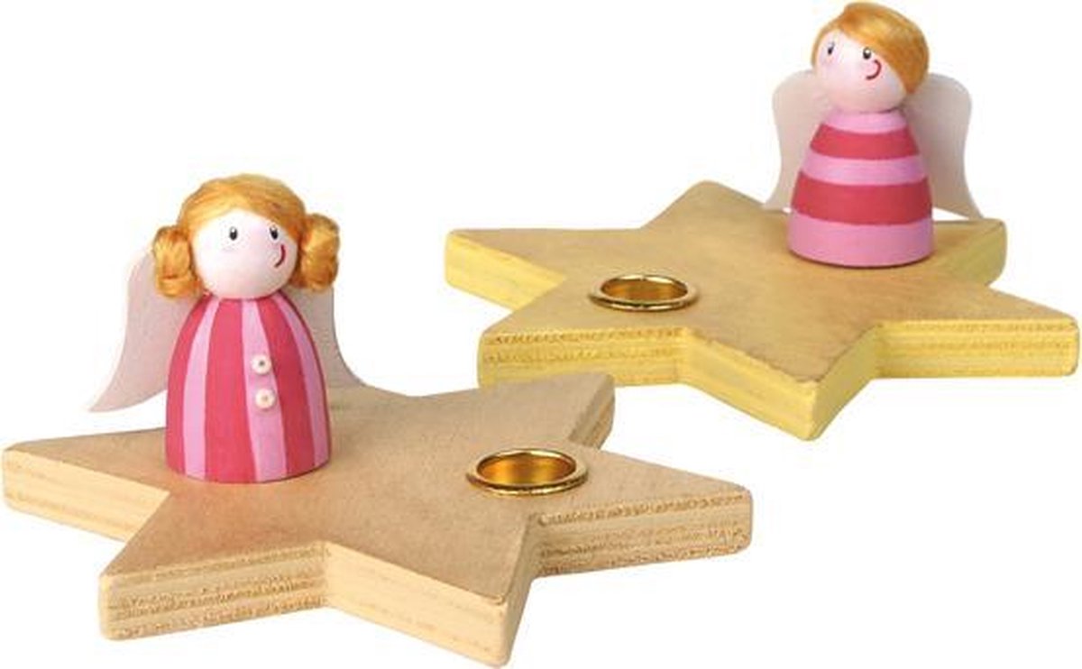 De engel met vleugels kan overal op de stervormige kandelaar worden geplaatst. Geschikt voor kaarsen met een diameter van 1,3 cm. Afmetingen: engel 4,5 cm hoog.