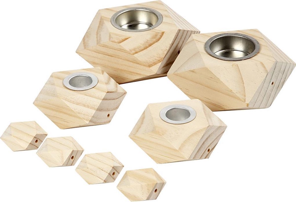 Set van 2 verschillende maten kandelaars elk van 2 stuks en 4 stuks grote kralen van licht hout. Een totaal van 8 delen met een gat (4 mm) voor het monteren van bijv. leerkoord.Set van 2 verschillende maten kandelaars elk van 2 stuks en 4 stuks grote kralen van licht hout. Een totaal van 8 delen met een gat (4 mm) voor het monteren van bijv. leerkoord.