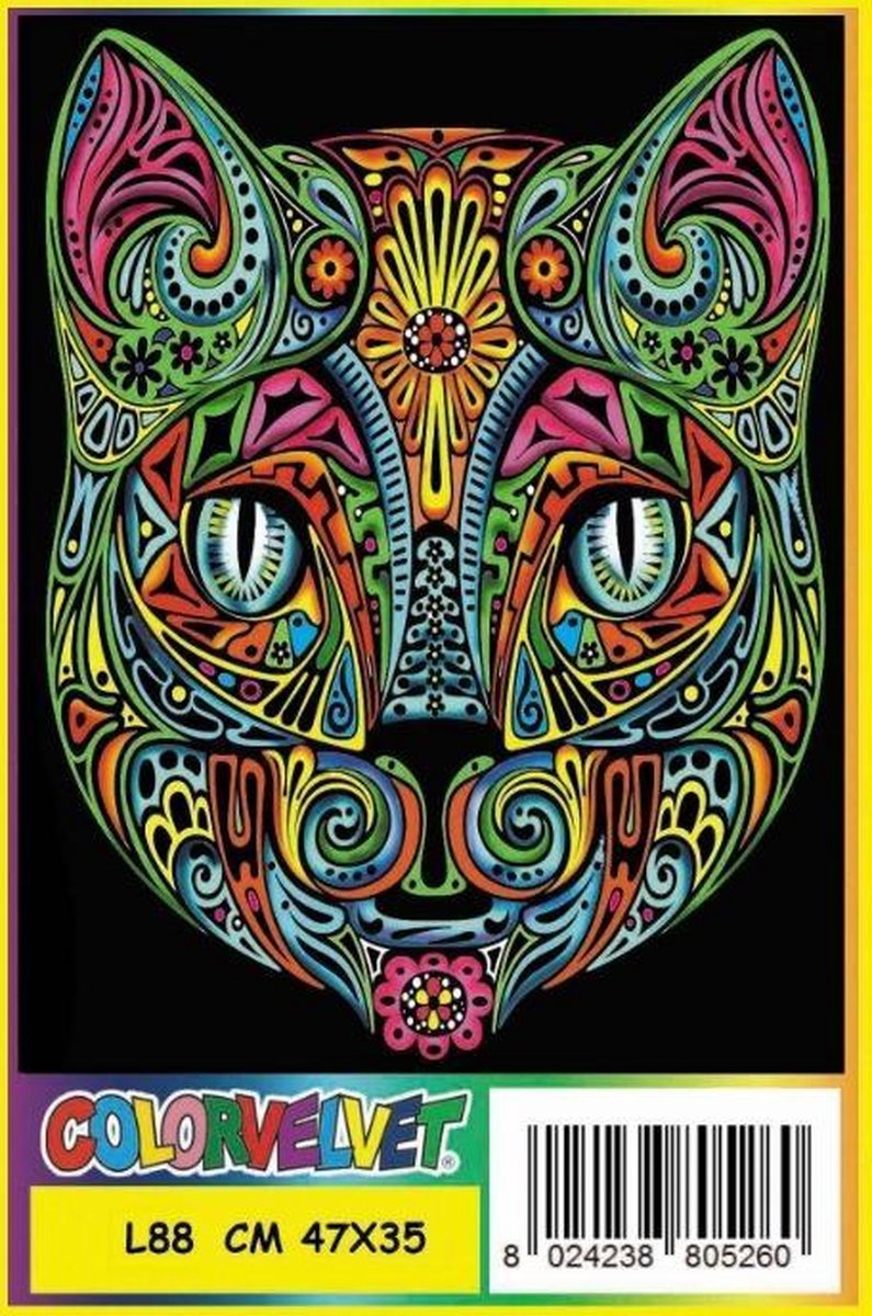Kattenkop Colorvelvet kleurpakket inclusief 12 stiften. Wat is Colorvelvet? Met Colorvelvet maak je de mooiste kunstwerken maar niet zoals de standaard kleurplaten. De tekeningen zijn gemaakt van een speciaal absorberend karton, gedeeltelijk bedekt met een 1mm dikke zwarte laag fluweel waardoor je een duidelijke scheiding krijgt met hetgeen wat je moet inkleuren. Behalve dat dit stuk fluweel ervoor zorgt dat je de witte vlakken makkelijk kunt inkleuren komt het zwarte fluweel naar voren wat een heel chique geheel geeft op je Colorvelvet kleurplaat. Deze tekeningen zijn eenvoudig, dit maakt Colorvelvet leuk en leerzaam waardoor dit ideaal is voor alle leeftijden vanaf 3 jaar en ouder. Met colorvelvet hebben kinderen plezier en leren ze tegelijkertijd, waardoor ze kleurrijke tekeningen maken waarmee ze ook hun slaapkamer kunnen versieren. Maar ook voor volwassenen is Colorvelvet zeer geschikt om lekker creatief bezig te zijn. De tekeningen kan je op allerlei verschillende manieren